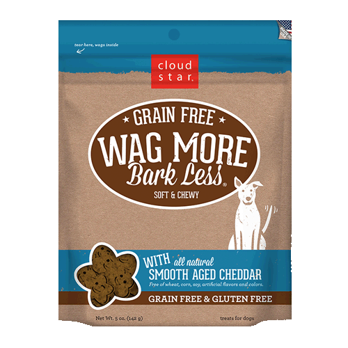 Wag More Bark Less Grain-Free Soft & Chewy - Smooth-Aged CheddarWag More Bark Less Grain Free Soft & Chewy Treats have a mouth-watering flavor and soft texture without the grain or the nasty preservatives found in other soft treatsIngredients: Cheddar Cheese, Chickpea Flour, Ground Flaxseed, Pea Flour, Tapioca Starch, Maple syrup, Vegetable Glycerin, expeller pressed canola oil, Sea Salt, Phosphoric Acid, Sorbic Acid, Natural Smoke Flavor, Lecithin, Mixed Tocopherols (natural preservative).Guaranteed Analysis: Crude Protein (min) 9.0%, Crude Fat (min) 8.0%, Crude Fiber (max) 5.0%, Moisture (max) 30.0%Calorie Content: 2570 kcal/kg7.70 kcal/treatAvailable Size: 5 oz