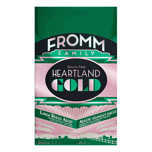 Fromm Heartland Gold Grain-Free Large Breed AdultIngredients: Beef, Pork Meat Meal, Peas, Lentils, Chickpeas, Potatoes, Dried Sweet Potatoes, Dried Tomato Pomace, Pork Liver, Dried Whole Egg, Flaxseed, Pork Fat, Salmon Oil, Pea Flour, Cheese, Lamb, Brewers Dried Yeast, Alfalfa Meal, Potassium Chloride, Carrots, Lettuce, Celery, Salt, Monosodium Phosphate, L-Tryptophan, DL-Methionine, Taurine, Chicory Root Extract, Yucca Schidigera Extract, Sodium Selenite, Sorbic Acid (Preservative), Vitamins, Minerals, Probiotics.Guaranteed Analysis:-Crude Protein (min.) 24%-Crude Fat (min.) 12%-Crude Fiber (max.) 6%-Moisture (max.) 10%Calorie Content:3,758 kcal/kg1,709 kcal/lb380 kcal/cupAvailable Sizes: 12 lbs, 26 lbs