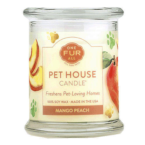 One Fur All Scented Candle - Mango Peach Mango Peach is a tropical fruity fragrance combining mango, and peach and melon with a subtle hint of tangerine and jasmine.