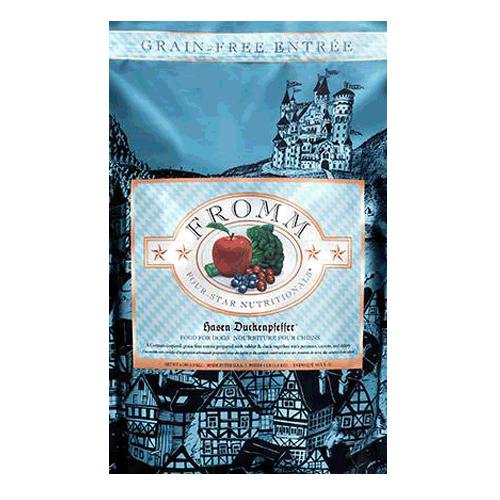 Fromm Hasen Duckenpfeffer Dog Food - Grain FreeA German-inspired, grain-free entrée prepared with rabbit & duck together with potatoes, carrots, and celeryIngredients: Rabbit, Duck, Pork Meat Meal, Peas, Potatoes, Lentils, Chickpeas, Pea Flour, Dried Tomato Pomace, Dried Whole Egg, Pork Fat, Rabbit Meal,Pork Liver, Pea Protein, Salmon Oil,Cheese, Flaxseed, Alfalfa Meal, Carrots, Celery, Lettuce, Watercress, Spinach, Potassium Chloride, Salt, Chicory Root Extract, Yucca Schidigera Extract, Sodium Selenite, Folic Acid, Taurine, Parsley, Sorbic Acid (Preservative), Vitamins, Minerals, Probiotics.Guaranteed Analysis:-Crude Protein (min.) 28%-Crude Fat (min.) 17%-Crude Fiber (max.) 6%-Moisture (max.) 10%Calorie Content:3856 kcal/kg393 kcal/cupAvailable Sizes: 4 lbs, 12 lbs, & 26 lbs