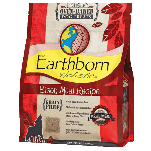 Earthborn Holistic Oven-Baked Bison Biscuits for DogsIngredients: Bison Meal, Peas, Pea Protein, Tapioca, Pea Fiber, Krill Meal, Canola Oil (preserved with mixed Tocopherols), Natural Flavors, Apples, Blueberries, Cranberries, Carrots, Spinach, Mixed Tocopherols (preservative), Rosemary Extract, Green Tea Extract, Dried Lactobacillus Acidophilus Fermentation Product, Dried Enterococcus Faecium Fermentation Product, Dried Lactobacillus Casei Fermentation Product.Guaranteed Analysis:-Crude Protein (Min.) 28%-Crude Fat (min.) 6%-Crude Fiber (max.) 5%-Moisture (max.) 10%Calorie Content:3,075 kcal/kg9 kcal/treatAvailable Sizes: 14 oz, 2 lbs