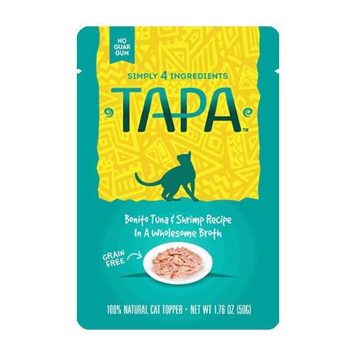 Tapa Bonito Tuna & Shrimp Recipe Cat Pouch· Fish is the First Ingredient, Not Water· NO Xanthan Gum· NO Guar Gum· NO Carrageenan Gum· Dolphin & Turtle Safe· Use as a Topper for your Cat’s Food· Grain FreeIngredients: Bonito Tuna, Fish Broth, Shrimp, Tapioca StarchGuaranteed Analysis: -Crude Protein (min.) 11%-Crude Fat (min.) 0.45%-Crude Fiber (max.) 0.5%-Moisture (max.) 87%*intended for supplemental feeding*