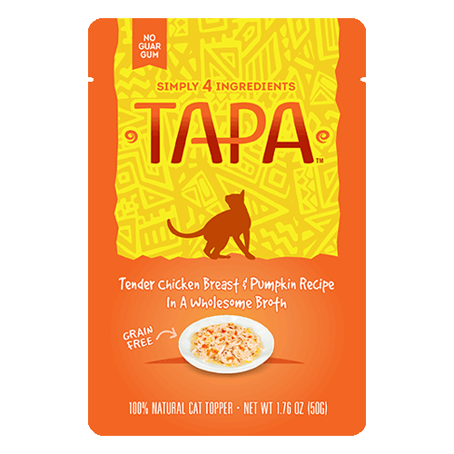 Tapa Chicken Breast & Pumpkin Recipe Cat Pouch· Chicken Breast is the First Ingredient, Not Water· · NO Xanthan Gum· NO Guar Gum· NO Carrageenan Gum· Use as a Topper for your Cat’s Food· Grain FreeIngredients: Chicken, Chicken Broth, Pumpkin, Tapioca StarchGuaranteed Analysis: -Crude Protein (min.) 11%-Crude Fat (min.) 0.45%-Crude Fiber (max.) 0.5%-Moisture (max.) 87%*intended for supplemental feeding*
