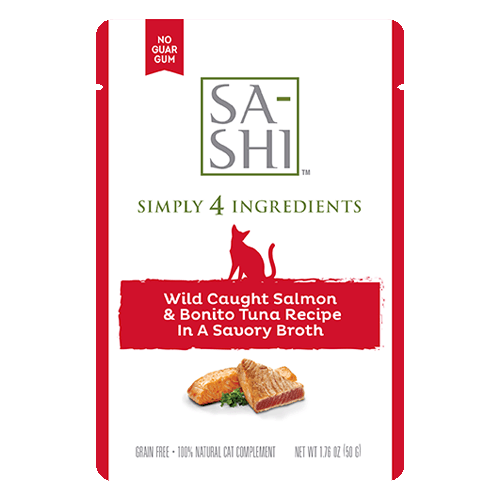 Sa-Shi Wild Caught Salmon & Bonito Tuna Cat Pouch· Fish is the First Ingredient, Not Water· NO Xanthan Gum· NO Guar Gum· NO Carrageenan Gum· Dolphin & Turtle Safe· Grain FreeIngredients: Salmon, Fish Broth, Bonito Tuna, Tapioca StarchGuaranteed Analysis: -Crude Protein (min.) 11%-Crude Fat (min.) 0.45%-Crude Fiber (max.) 0.5%-Moisture (max.) 87%*intended for supplemental feeding*