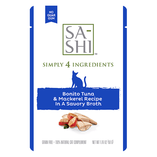 Sa-Shi Bonito Tuna & Mackerel Cat Pouch· Fish is the First Ingredient, Not Water· NO Xanthan Gum· NO Guar Gum· NO Carrageenan Gum· Dolphin & Turtle Safe· Grain FreeIngredients: Bonito Tuna, Fish Broth, Mackerel, Tapioca StarchGuaranteed Analysis: -Crude Protein (min.) 12%-Crude Fat (min.) 0.45%-Crude Fiber (max.) 0.5%-Moisture (max.) 87%*intended for supplemental feeding*