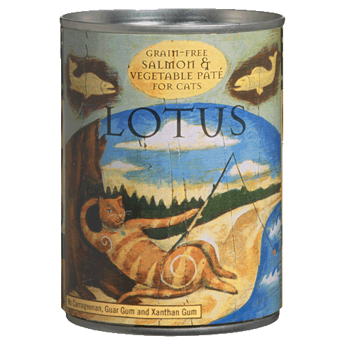 Lotus Grain-Free Salmon Pate Canned Cat FoodIngredients: Salmon Broth, Salmon, Tilapia, Tuna, Dried Peas, Natural Chicken Liver Flavor, Agar-Agar, Calcium Sulfate, Carrots, Asparagus, Cranberries, Blueberries, Ground Whole Flaxseed, New Zealand Green Mussel, Eggs, Clams, Organic Soybean Oil, Olive Oil, Tricalcium Phosphate, Sea Salt, Dried Kelp, Potassium Chloride, Choline Chloride, Betaine, Zinc Proteinate, Iron Proteinate, Niacin, Vitamin E Supplement, Thiamine Mononitrate, Copper Proteinate, Manganese Proteinate, Sodium Selenite, Calcium Pantothenate, Vitamin A Supplement, Riboflavin, Pyridoxine Hydrochloride, Biotin, Vitamin B12 Supplement, Calcium Iodate, Vitamin D3 Supplement, Folic Acid.Guaranteed Analysis:-Crude Protein (min.) 8%-Crude Fat (min.) 5%-Crude Fiber (max.) 1.5%-Moisture (max.) 78%Calorie Content:389.4 kcal/12 oz canAvailable Size: 12 oz