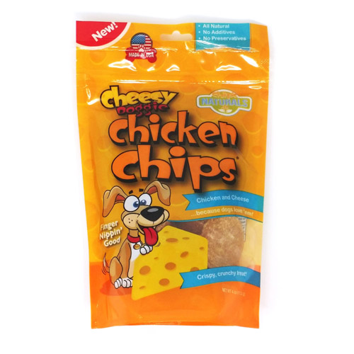 Kennel Master CHEESY Doggie Chicken ChipsThese naturally flavored cheesy chips have the same crispy crunch as our original Doggie Chicken Chips but with the added irresistible flavor of cheddar cheese. Still low-calorie and high in protein, Cheesy Doggie Chicken Chips will bring a cheesy smile to your dog’s lips!Ingredients: Chicken tenderloin, Natural cheese flavor.Guaranteed Analysis: Crude Protein (min.) 80%, Crude Fat 4.4%(min.), Crude Fiber (max) 1.65%, Moisture (max) 9.52%Calorie Content:95kcals/oz3345.5kcal/kgAvailable Sizes: 4 oz
