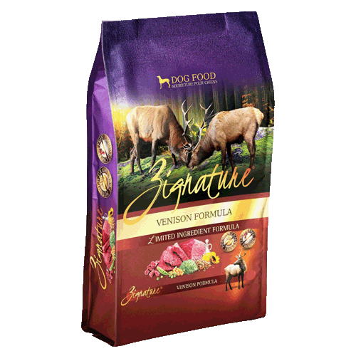 Zignature Venison Dry Dog FoodVenison is always an excellent meat choice. It contains a higher protein content than any other red meat, which means it satiates the appetite very well. It is also very rich in iron, more than your typical beef, which helps keep your pet’s energy level high. Venison contains a high level of B vitamins and its lean fat content produces high levels of Conjugated Linoleic Acid (CLA). All of these positive attributes combined with a balanced formula provides your pet with a nutritious product that meets all of its needs.Ingredients: Venison, Venison Meal, Pea Flour, Chickpeas, Peas, Sunflower Oil (Preserved With Mixed Tocopherols), Flaxseed, Natural Flavors, Suncured Alfalfa Meal, Calcium Carbonate, Salt, Minerals (Zinc Proteinate, Iorn Proteinate, Copper Proteinate, Manganese Proteinate, Cobalt Proteinate), Choline Chloride, Potassium Chloride, Vitamins (Vitamin A Acetate, Vitamin D3 Supplement, Vitamin E Supplement, Niacin, D-Calcium Pantothenate, Thiamine Mononitrate, Pyridoxine Hydrochloride, Riboflavin Supplement, Folic Acid, Biotin, Vitamin B12 Lactic Supplement), Lactic Acid, Calcium Iodate, Sodium Selenite.Guaranteed Analysis:-Crude Protein (min.) 27%-Crude Fat (min.) 15%-Crude Fiber (max.) 5%-Moisture (max.) 10%Calorie Content: 408 Calories/CupAvailable Sizes: 4 lbs, 13 lbs, 27 lbs