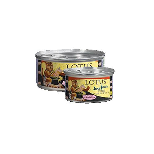 Lotus Grain-Free Just Juicy Pork Canned Cat FoodIngredients: Pork, Pork Broth, Potato Starch, Calcium Lactate, Carrots, Olive Oil, Monosodium Phosphate, Salt, Agar-Agar, Sunflower Oil, Potassium Chloride, Taurine, Magnesium Oxide, Calcium Carbonate, Choline Chloride, Betaine, Zinc Proteinate, Iron Proteinate, Niacin, Vitamin E Supplement, Thiamine Mononitrate, Copper Proteinate, Manganese Proteinate, Sodium Selenite, Calcium Pantothenate, Vitamin A Supplement, Riboflavin, Pyridoxine Hydrochloride, Biotin, Vitamin B12 Supplement, Calcium Iodate, Vitamin D3 Supplement, Folic Acid.Guaranteed Analysis:-Crude Protein (min.) 13%-Crude Fat (min.) 3%-Crude Fiber (max.) 0.5%-Moisture (max.) 78%Calorie Content:982.5 kcal/kg (68.8 kcal/can)Available Size: 2.75 oz