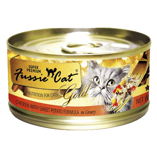 Fussie Cat Chicken & Sweet Potato in GravyIngredients: Water Sufficient For Processing, Boneless Chicken, Sweet Potato, Carrot, Brown Rice, Tapioca Starch, Sunflower Seed Oil, Tricalcium Phosphate, Locust Bean Gum, Calcium Lactate, Chicken Broth, Salt, Choline Chloride, Fructooligosaccharide, Taurine, Zinc Sulfate, Vitamin E Supplement., Ferrous Sulfate, Thiamine Mononitrate (Source of Vitamin B1), Nicotinic Acid (Source of Vitamin B3), Calcium Pantothenate, Vitamin A Supplement, Potassium Iodide, Manganese Sulfate, Copper Sulfate, Vitamin D3 Supplement, Riboflavin Supplement (Source of Vitamin B2), Pyridoxine Hydrochloride (Source of Vitamin B6), Folic Acid, Vitamin B12 Supplement.Guaranteed Analysis:-Crude Protein (min.) 9%-Crude Fat (min.) 1.5%-Crude Fiber (min.) 0.1%-Moisture (max.) 85%Calorie Content:48 kcal/canAvailable Size: 2.82 oz