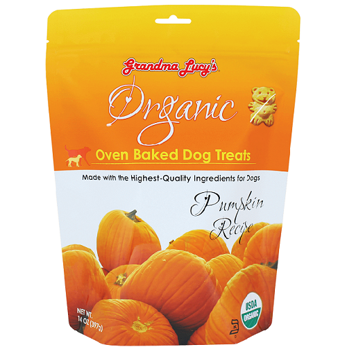 Grandma Lucy's Organic Baked Pumpkin Dog TreatsGrandma Lucy's organic dog treats are not made in a factory but baked in a bakery by people who love their pets. Since 1999, Grandma Lucy's has taken great pride in making wholesome, natural and delicious pet treats. Your dog will love the great taste of our Organic Oven-Baked Dog Treats, but what you will love most is the fact that they are made with organic, human-quality ingredients. The treats are so tasty, your dog will beg for more. Grandma Lucy's Organic Oven-Baked Dog Treats – an organic treat you will feel good about giving your pet.Ingredients: Organic Wheat Flour, Organic Dehydrated Cane Juice, Organic Canola Oil, Organic Brown Sugar, Organic Cane Juice Syrup, Organic Rice Starch, Organic Pumpkin Powder, Organic Mace, Organic Cinnamon, Soy Lecithin.Guaranteed Analysis:-Crude Protein (min.) 6%-Crude Fat (min.) 16%-Crude Fiber (max.) 0.36%-Moisture (max.) 8%Available Size: 14 oz
