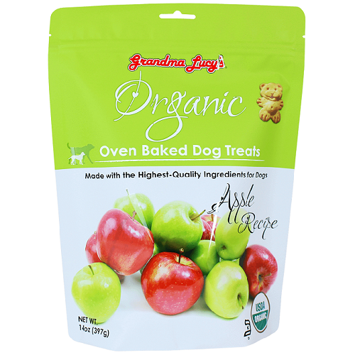 Grandma Lucy's Organic Baked Apple Dog TreatsGrandma Lucy's organic dog treats are not made in a factory but baked in a bakery by people who love their pets. Since 1999, Grandma Lucy's has taken great pride in making wholesome, natural and delicious pet treats. Your dog will love the great taste of our Organic Oven-Baked Dog Treats, but what you will love most is the fact that they are made with organic, human-quality ingredients. The treats are so tasty, your dog will beg for more. Grandma Lucy's Organic Oven-Baked Dog Treats – an organic treat you will feel good about giving your pet.Ingredients: Organic Wheat Flour, Organic Dehydrated Cane Juice, Organic Sunflower and/or Organic Canola Oil and/or Organic Palm Oil, Organic Brown Sugar, Organic Cane Juice Syrup, Organic Apple Powder, Organic Vanilla Extract, Organic Cinnamon, Soy Lecithin.Guaranteed Analysis:-Crude Protein (min.) 5.5%-Crude Fat (min.) 17%-Crude Fiber (max.) 0.73%-Moisture (max.) 8%Available Size: 14 oz