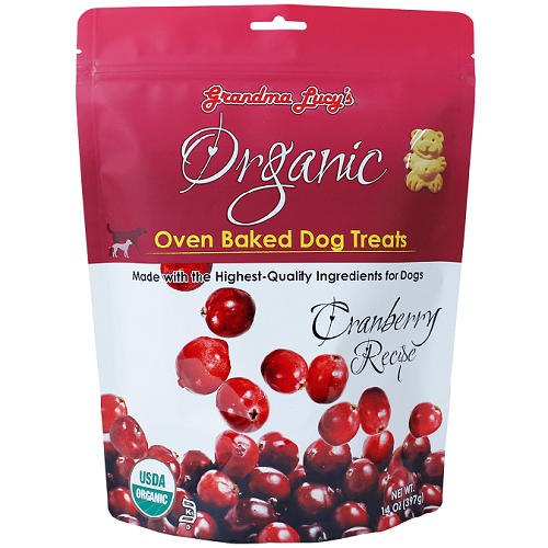 Grandma Lucy's Organic Baked Cranberry Dog TreatsGrandma Lucy's organic dog treats are not made in a factory but baked in a bakery by people who love their pets. Since 1999, Grandma Lucy's has taken great pride in making wholesome, natural and delicious pet treats. Your dog will love the great taste of our Organic Oven-Baked Dog Treats, but what you will love most is the fact that they are made with organic, human-quality ingredients. The treats are so tasty, your dog will beg for more. Grandma Lucy's Organic Oven-Baked Dog Treats – an organic treat you will feel good about giving your pet.Ingredients: Organic Wheat Flour, Organic Dehydrated Cane Sugar, Organic Palm Oil, Organic Cane Juice Syrup, Organic Cranberry Powder, Organic Cranberry Flavor, Soy Lecithin.Guaranteed Analysis:-Crude Protein (min.) 6.4%-Crude Fat (min.) 17%-Crude Fiber (max.) 0.7%-Moisture (max.) 9%Available Size: 14 oz