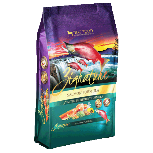 Zignature Salmon Dry Dog FoodMade with Salmon from the cold waters of the Northwestern USA. Salmon provides a high-quality source of complete protein loaded with essential heart-friendly Omega-3 Fatty Acids, is rich in Vitamin B12, and provides Niacin, Zinc and Phosphorus. Our nutritionally correct ratio of vegetables rounds out the recipe with powerful antioxidants, and fiber-rich low glycemic carbohydrates.Ingredients: Salmon, Salmon Meal, Pea Flour, Chickpeas, Peas, Sunflower Oil (Preserved With Mixed Tocopherols And Citric Acid), Flaxseed, Natural Flavors, Suncured Alfalfa Meal, Calcium Carbonate, Salt, Choline Chloride, Minerals (Zinc Proteinate, Iron Proteinate, Copper Proteinate, Manganese Proteinate, Cobalt Proteinate), Potassium Chloride, Vitamins (Vitamin A Acetate, Vitamin D3Supplement, Vitamin E Supplement, Niacin, D-Calcium Pantothenate, Thiamine Mononitrate, Pyridoxine Hydrochloride, Riboflavin Supplement, Folic Acid, Biotin, Vitamin B12 Lactic Supplement), Lactic Acid, Calcium Iodate, Sodium SeleniteGuaranteed Analysis:-Crude Protein (min.) 29%-Crude Fat (min.) 16%-Cruder Fiber (max.) 5%-Moisture (max.) 10%Calorie Content:415 kcal/cupAvailable Sizes: 4 lbs, 13.5 lbs, 27 lbs