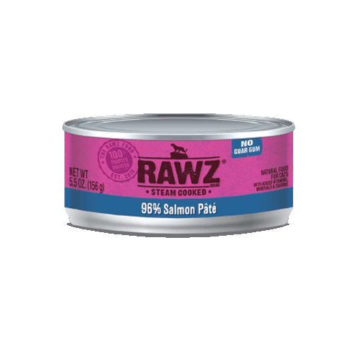 Rawz 96% Salmon Pate Canned Cat FoodIngredients: Salmon, Fish Broth, Tricalcium Phosphate, Potassium Chloride, Fenugreek Seeds, Natural Flavor, Salt, Vegetable Broth, Taurine, Calcium Carbonate, Zinc Proteinate, Iron Proteinate, Niacin Supplement, Vitamin E Supplement, Copper Proteinate, Sodium Selenite, Thiamine Mononitrate, Manganese Proteinate, Vitamin A Supplement, Calcium Pantothenate, Riboflavin Supplement, Pyridoxine Hydrochloride, Biotin, Vitamin D3 Supplement, Vitamin B12 Supplement, Ethylenediamine Dihydroiodide, Folic Acid.Guaranteed Analysis:-Crude Protein (min.) 11%-Crude Fat (min.) 9.5%-Crude Fiber (max.) 1%-Moisture (max.) 78%Calorie Content:1,275 kcal/kg or 199 kcal/can.Available Size: 5.5 oz