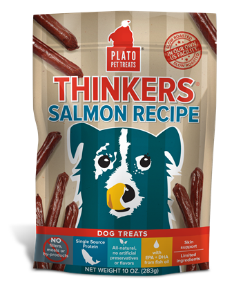 Plato Thinkers SalmonPlato Pet Treats Salmon Thinkers are FREE from added sugars, artificial preservatives, by-products, artificial colors, protein-meals, soy, wheat, corn, fillers, and freeze-drying. Slow roasted in our own US Facility, these treats can be snapped into pieces for training dogs of all sizes or to share. Plato Thinker Sticks are grain-reduced with gluten free brown rice being the only grain ingredient. Brain-nourishing natural DHA and EPA helps support brain function in your dog. Flavors include pacific salmon, duck, chicken are available in 22oz, and 10oz bags or a single 1.2oz serving.Ingredients:Salmon, brown rice, pea fiber, salt, sodium alginate, fish oil (Source of EPA and DHA), vegetable glycerin, citric acid, distilled white vinegar, mixed tocopherols (a preservative), vitamin E supplement, L-ascorbyl-2-Monophospate (a source of vitamin C), rosemary extract.Nutrition:Crude Protein 40% min.Crude Fat 27% min.Crude Fiber 1% max.Moisture 16% max.Vitamin E 100 IU/kg min.Ascorbic Acid (vitamin c)* 50 mg/kg min.Omega 3 fatty acids* 2.9% min.Omega 6 fatty acids* 0.1% min.4439.1 kcal/kg107 kcal/treat