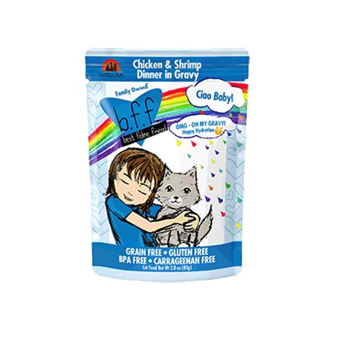 BFF O.M.G. Ciao Baby Chicken & Shrimp Cat Food PouchBFF Oh My Gravy! Cat Food Recipes are formulated to meet nutritional levels established by the AAFCO Nutrient Profiles for Adult Maintenance. Feed according to the age, size and activity of your cat. If fed alone, feed 1.0 oz for each pound of bodyweight daily, best fed twice a day. Your cat should have access to clean, fresh water. Refrigerate after opening.Ingredients: Chicken Broth, Chicken, Tuna, Shrimp, Potato Starch, Guar Gum, Calcium Lactate, Tricalcium Phosphate, Choline Chloride, Taurine, Zinc Sulfate, Vitamin E Supplement, Thiamine Mononitrate (Vitamin B1), Niacin Supplement (Vitamin B3), Calcium Panthotenate, Vitamin A Supplement, Potassium Iodide, Manganese Sulfate, Riboflavin Supplement (Vitamin B2), Pyridoxine Hydrochloride (Vitamin B6), Ferrous Sulfate, Copper Sulfate, Vitamin D3 Supplement, Folic Acid, Vitamin B12 Supplement, Menadione Sodium Bisulfite Complex (Source of Vitamin K)