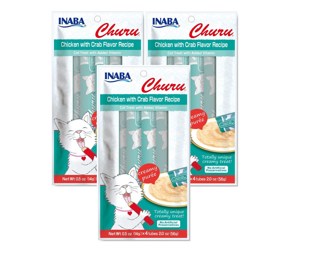 Churu Purees Chicken with Crab 2ozIngredients: Water, Chicken, Tapioca, Natural Flavors, Natural Crab Flavor, Guar Gum, Fructooligosaccharide, Vitamin E Supplement, Green Tea Extract.Guaranteed Analysis:-Crude Protein (min.) 7%-Crude Fat (min.) 0.2%-Crude Fiber (max.) 0.1%-Moisture (max.) 91%Calorie Content:430 kcal/kg6.0 kcal/tubeAvailable Sizes: 2 oz (4 pack)