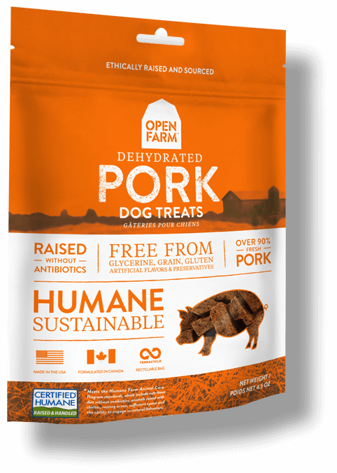 Open Farm: Dehydrated Dog Treats - PorkHUMANELY RAISED PORK, FREE FROM ANTIBIOTICS & GROWTH HORMONES, DEHYDRATED AT LOW TEMPERATURES TO FORM A HEALTHY & TASTY TREAT
