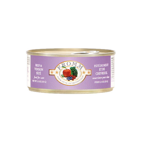 Fromm Beef & Venison Pate Canned Cat FoodIngredients: Beef, Beef Broth, Beef Liver, Venison,Lentils, Sweet Potatoes, Tomato Paste,Salmon Oil, Salt, Potassium Chloride,Minerals, Calcium Sulfate, Xanthan Gum, Locust Bean Gum, Taurine,Vitamins.Guaranteed Analysis:-Crude Protein (min.): 11%-Crude Fat (min.): 5%-Crude Fiber (max.): 1.2%-Moisture (max.): 78%Calorie Content:997 kcal/kg155 kcal/can
