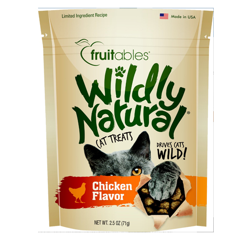 Fruitables Wildly Natural Chicken Cat TreatsIngredients: Chicken Meal, Rice Flour, Barley, Pea Fiber, Chicken Broth, Flaxseed, Natural Flavor, Vinegar, Brewers Yeast, Salt, Citric Acid, Sunflower Lecithin.Guaranteed Analysis:-Crude Protein (min.) 28%-Crude Fat (min.) 12%-Crude Fiber (max.) 8%-Moisture (max.) 10%Calorie Content:3,120 kcal/kg 1.9 per treatAvailable Sizes: 2.5 oz