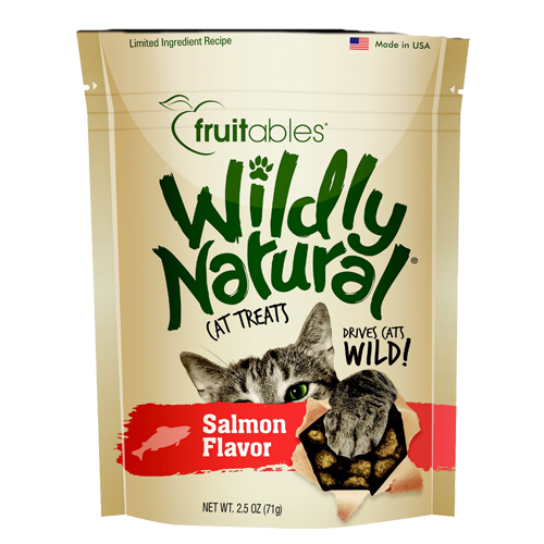 Fruitables Wildly Natural Salmon Cat TreatsIngredients: Chicken Meal, Rice Flour, Barley, Pea Fiber, Chicken Broth, Salmon Meal, Flaxseed, Natural Flavor, Vinegar, Brewers Yeast, Salt, Citric Acid, Sunflower Lecithin.Guaranteed Analysis:-Crude Protein (min.) 28%-Crude Fat (min.) 12%-Crude Fiber (max.) 8%-Moisture (max.) 10%Calorie Content:3,120 kcal/kg 1.9 per treatAvailable Sizes: 2.5 oz