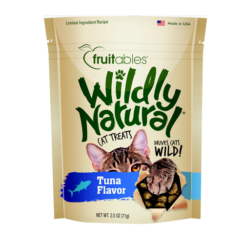 Fruitables Wildly Natural Tuna Cat TreatsIngredients: Chicken Meal, Rice Flour, Barley, Pea Fiber, Chicken Broth, Tuna Meal, Flaxseed, Natural Flavor, Vinegar, Brewers Yeast, Salt, Citric Acid, Sunflower Lecithin.Guaranteed Analysis:-Crude Protein (min.) 28%-Crude Fat (min.) 12%-Crude Fiber (max.) 8%-Moisture (max.) 10%Calorie Content:3,120 kcal/kg 1.9 per treatAvailable Sizes: 2.5 oz
