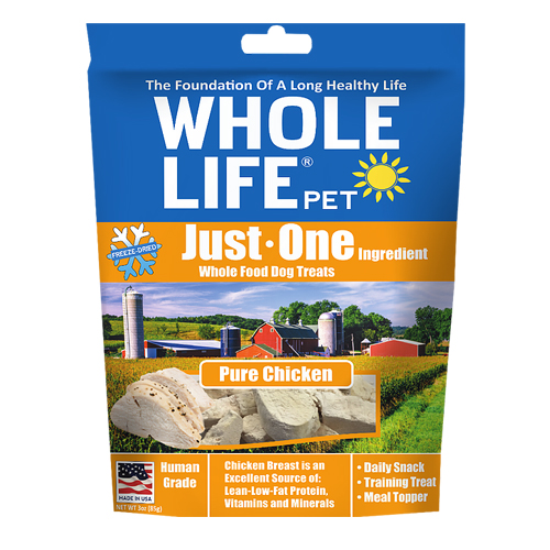 Whole Life Pet Just One Ingredient Chicken Dog TreatsA single ingredient, protein rich, low calorie treat with intense natural flavor. Just One treats are ideal for all dogs, but due to their simple 1 ingredient formulation, are especially great for dogs with food allergies, stomach sensitivity or who struggle with weight gain. Designed as a healthy daily snack made from pure USDA Human Grade Chicken Breast. We slice, gently steam, then freeze dry Just One Pure Chicken Breast treats to lock in nutrients and concentrate natural flavors. Grain and gluten free and made without fillers, chemicals, additives or anything artificial. Ingredients: ChickenGuaranteed Analysis:-Crude Protein (min.) 80%-Crude Fat (min.) 16%-Crude Fiber (max.) 1%-Moisture (max.) 4%Calorie Content:6.2 kcal/gAvailable Size: 3 oz