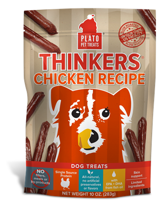 Plato Thinkers ChickenPlato Pet Treats Chicken Thinkers are FREE from added sugars, artificial preservatives, by-products, artificial colors, protein-meals, soy, wheat, corn, fillers, and freeze-drying. Slow roasted in our own US Facility, these treats can be snapped into pieces for training dogs of all sizes or to share. Plato Thinker Sticks are grain-reduced with gluten free brown rice being the only grain ingredient. Brain-nourishing natural DHA and EPA helps support brain function in your dog. Flavors include pacific salmon, duck, chicken are available in 22oz, and 10oz bags or a single 1.2oz serving.Ingredients:Chicken, brown rice, pea fiber, salt, sodium alginate, fish oil (Source of EPA and DHA), vegetable glycerin, citric acid, distilled white vinegar, mixed tocopherols (a preservative), vitamin E supplement, L-ascorbyl-2-Monophospate (a source of vitamin C), rosemary extract.Nutrition:Crude Protein 40% min.Crude Fat 27% min.Crude Fiber 1% max.Moisture 15% max.Vitamin E 100 IU/kg min.Ascorbic Acid (vitamin c)* 50 mg/kg min.4488.1 kcal/kg108 kcal/treat
