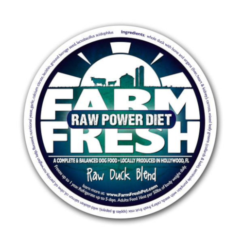 100% Raw Formula. Made with 80% USDA Grade A Whole Duck and 20% raw veggies. Let your dog harness the power of raw foods. Our veggies are locally sourced from local farmers when seasonally available. Farm Fresh Raw Duck Blend Dog Food features wholesome veggies including carrots, kale, collard greens, seminole pumpkin or calabaza, celery, parsley, apples and papaya. We supplement with superfoods that provide highly digestible and natural sources of vitamins and minerals. Give you dog the power of raw nutrition.