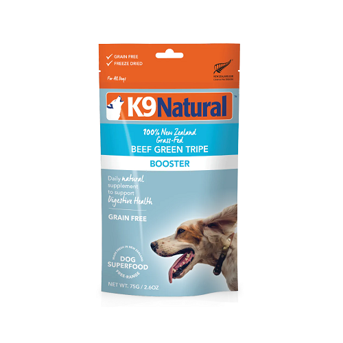 Hailed as a highly palatable, natural superfood, Green Tripe is a fantastic supplement containing an abundance of vital nutrients for your dog. Sourcing only the highest quality New Zealand grass-fed, free-range Beef Tripe, our K9 Natural Freeze-Dried Boosters aid digestion, skin, coat, and immune function. We highly recommend the use of this superfood to aid in transitioning your dog to a new diet.
