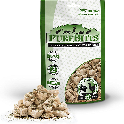 PureBites Freeze Dried Chicken & CatnipGo ahead, turn the bag around and look at our ingredients. Made with only 2 ingredients; 100% Pure & Natural USA Raised Chicken Breast & USA Grown Organic Catnip. Cats love the taste of PureBites® because our treats are freeze dried RAW to lock in the aroma, texture and freshness they crave. Cat parents love PureBites® because our treats are 100% pure and rich in nutrients for a happy and healthy life.