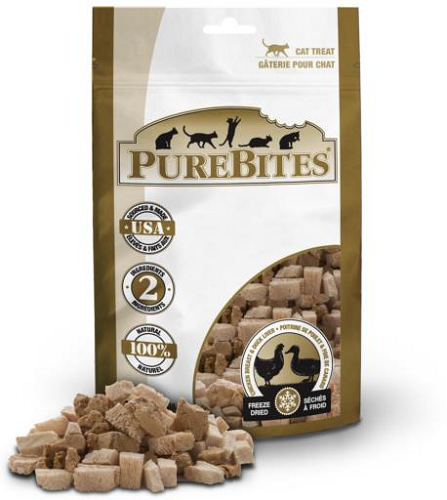 PureBites Freeze Chicken & DuckGo ahead, turn the bag around and look at our ingredients. Made with only 2 ingredients; 100% Pure USA Sourced & Made Human Grade Chicken Breast & Duck Liver. Cats love the taste of PureBites® because our treats are freeze dried RAW to lock in the aroma, texture and freshness they crave. Cat parents love PureBites® because our treats are 100% pure and rich in nutrients for a happy and healthy life.
