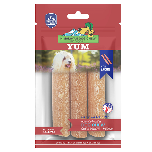 Himalayan Yum Bacon Flavor Dog ChewyakyYUM is a medium density cheese chew, great for the everyday chewer. These dense chews support oral health while satisfying your dog’s natural need to chew. yakyYUM is an all-natural, long-lasting chew for all sizes and ages of dogs. Made in Washington State with locally sourced, limited ingredients and with our deeply rooted, traditional Himalayan cheese recipe. yakyYUM is available in 4 tasty flavors; cheese, cheese with real bacon, cheese with real peanut butter and cheese with real chicken.