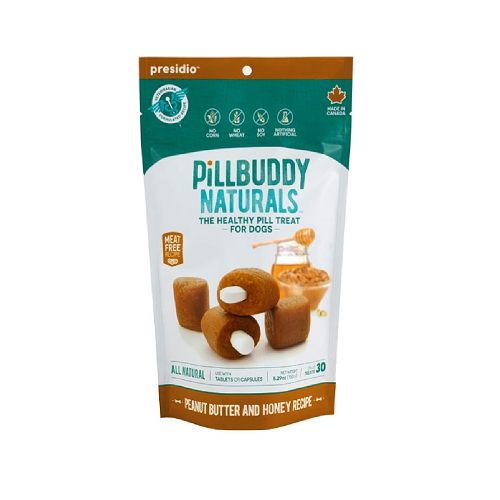 Pill Buddy Naturals is free of corn, wheat, soy and anything artificial. They are ‘marinated’ in an exclusive blend of natural ingredients that provides excellent mouth‐feel, impact and texture, providing a unique surface for the treat to be swallowed whole. This prevents the dog from biting into bitter tasting medicine and spitting it out.