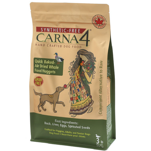 Carna4 Grain-free Duck is whole food nutrition for all life stages of your dog. Our Canadian-made pet food starts with fresh duck (we use the muscle and flesh, no by-products) from humanely-raised ducks on Quebec and Ontario farms. No meat or vegetable meals, ever. We then add pork liver, whole eggs, clean, de-boned herring, whole produce, our certified organic sprouted seeds and nutrient-rich kelp We then quick-bake & gently dry it to give your dog highly digestible vitamins and minerals, without grain or synthetic additives of any kind. No vitamin pre-mix needed, ever.
