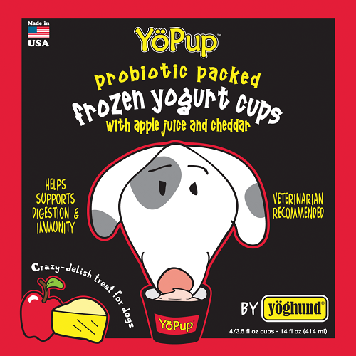 Yoghund Frozen Yogurt - All Natural Apple & CheddarWe know how good yogurt is for dogs, but we decided to liven things up with crisp apple juice and real cheddar cheese. The added flavor and vitamins make this an irresistible combination your dog is sure to enjoy. They’ll have no idea the billions of beneficial cultures they’re ingesting will keep them on the top of their game. After all, prevention is the best medicine!Ingredients - Natural low fat Yogurt, Natural Apple Juice Concentrate, Natural Cheddar Cheese, Natural Inulin, Natural Guar Gum and Natural Gum Arabic, Lactase, Live Active Cultures.GUARANTEED ANALYSIS - 51 calories per servingCrude protein (min) 5.0%Crude fat (min) 4.0%Crude fiber (max) 2.0%