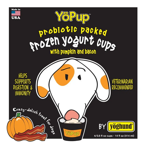 Yoghund Frozen Yogurt - All Natural Pumpkin & BaconThis flavor combination is a home run for dogs! In addition to the known benefits of yogurt, we have added pumpkin; a yummy taste and a great source of fiber that helps with digestive regularity and tummy issues. Then comes the irresistible taste of bacon, just because dogs can’t get enough! Don’t be surprised when your best friend starts worshiping the freezer, waiting for the next yummy cup of Pumpkin & Bacon YöPup.Ingredients - Natural low fat Yogurt, Natural Pumpkin Puree, All Natural Bacon Flavor, Natural Inulin, Natural Guar Gum and Natural Gum Arabic, Lactase, Live Active Cultures.GUARANTEED ANALYSIS - 70 calories per servingCrude protein (min) 10.0%Crude fat (min) 4.0%Crude fiber (max) 4.0%