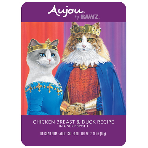 Aujou by Rawz Chicken & Duck Recipe for CatsINGREDIENTS: Chicken, Chicken Broth, Duck, Tapioca Starch, Minerals (Magnesium Amino Acid Chelate, Zinc Amino Acid Chelate, Iron Amino Acid Chelate, Manganese Amino Acid Chelate, Copper Amino Acid Chelate, Calcium Iodate, Sodium Selenite), Sunflower Oil, Calcium Chloride, Fish Oil, Tricalcium Phosphate, Vitamins (Ascorbic Acid (source of Vitamin C), Thiamine Mononitrate, Vitamin E Supplement, Niacin Supplement, Vitamin A Supplement, d-Calcium Pantothenate, Riboflavin Supplement, Pyridoxine Hydrochloride, Folic Acid, Biotin, Vitamin B12 Supplement, Vitamin D3 Supplement), Parsley, Choline Chloride, Salt, Taurine, Potassium Chloride.GUARANTEED ANALYSISCrude Protein(min) 11.00%Crude Fat(min) 1.50%Crude Fiber(max) 1.50%Moisture(max) 82.00%Magnesium(max) 0.03%Taurine(min) 0.10%