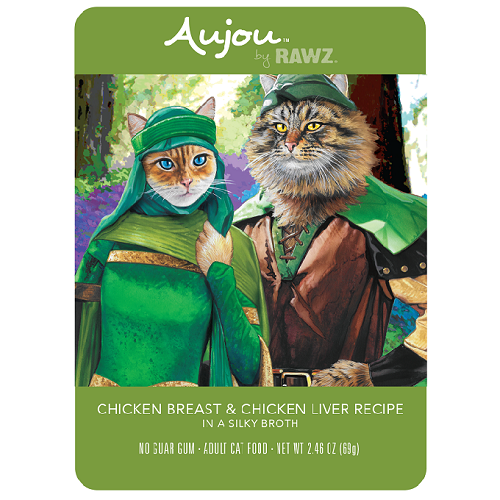 Aujou by Rawz Chicken & Chicken Liver Recipe for CatsINGREDIENTS: Chicken, Chicken Broth, Chicken Liver, Tapioca Starch, Sunflower Oil, Calcium Chloride, Minerals (Magnesium Amino Acid Chelate, Zinc Amino Acid Chelate, Iron Amino Acid Chelate, Manganese Amino Acid Chelate, Copper Amino Acid Chelate, Calcium Iodate, Sodium Selenite), Fish Oil, Vitamins (Ascorbic Acid (source of Vitamin C), Thiamine Mononitrate, Vitamin E Supplement, Niacin Supplement, Vitamin A Supplement, d-Calcium Pantothenate, Riboflavin Supplement, Pyridoxine Hydrochloride, Folic Acid, Biotin, Vitamin B12 Supplement, Vitamin D3 Supplement), Tricalcium Phosphate, Parsley, Choline Chloride, Salt, Taurine, Potassium Chloride.GUARANTEED ANALYSISCrude Protein(min) 11.00%Crude Fat(min) 1.50%Crude Fiber(max) 1.50%Moisture(max) 82.00%Magnesium(max) 0.03%Taurine(min) 0.10%