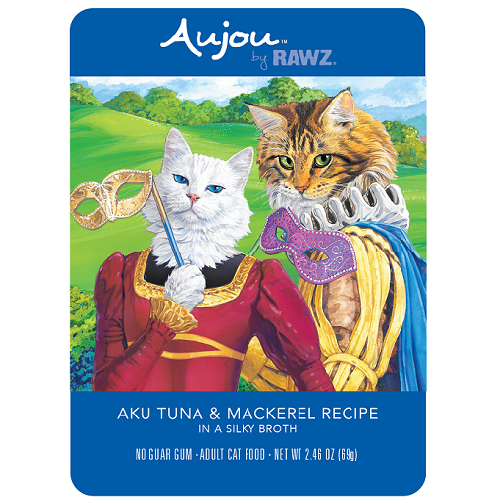Aujou by Rawz Aku Tuna & Mackerel Recipe for CatsINGREDIENTS: Tuna, Fish Broth, Mackerel, Tapioca Starch, Minerals (Zinc Amino Acid Chelate, Magnesium Amino Acid Chelate, Iron Amino Acid Chelate, Manganese Amino Acid Chelate, Calcium Iodate, Sodium Selenite), Sunflower Oil, Calcium Chloride, Tricalcium Phosphate, Vitamins (Ascorbic Acid (source of Vitamin C), Thiamine Mononitrate, Vitamin E Supplement, Niacin Supplement, Vitamin A Supplement, d-Calcium Pantothenate, Riboflavin Supplement, Pyridoxine Hydrochloride, Folic Acid, Biotin, Vitamin B12 Supplement, Vitamin D3 Supplement), Fish Oil, Parsley, Potassium Chloride, Taurine, Choline Chloride.GUARANTEED ANALYSISCrude Protein(min) 11.00%Crude Fat(min) 1.50%Crude Fiber(max) 1.50%Moisture(max) 82.00%Magnesium(max) 0.03%Taurine(min) 0.10%