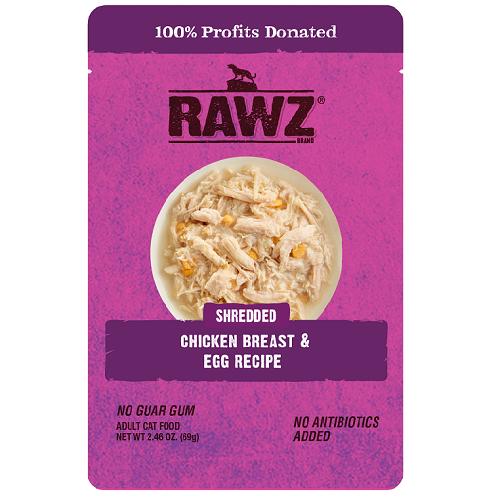 Rawz Shredded Chicken & Egg Recipe Cat FoodIngredients: Chicken, Chicken Broth, Egg, Tapioca Starch, Sunflower Oil, Calcium Chloride, Potassium Chloride, Salt, Choline Chloride, Taurine, Dried Parsley, Minerals (Iron Amino Acid Chelate, Manganese Amino Acid Chelate, Zinc Amino Acid Chelate, Calcium Iodate, Copper Amino Acid Chelate, Magnesium Amino Acid Chelate, Sodium Selenite), Vitamins (Vitamin A Supplement, Vitamin D3 Supplement, Vitamin E Supplement, Thiamine Mononitrate, Riboflavin Supplement, Pyridoxine Hydrochloride, Vitamin B12 Supplement, Niacin Supplement, d-Calcium Pantothenate, Ascorbic Acid (source of Vitamin C), Folic Acid, Biotin).Guaranteed Analysis:-Crude Protein (min.) 11%-Crude Fat (min.) 1.50%-Crude Fiber (max.) 1.50%-Moisture (max.) 82.00%