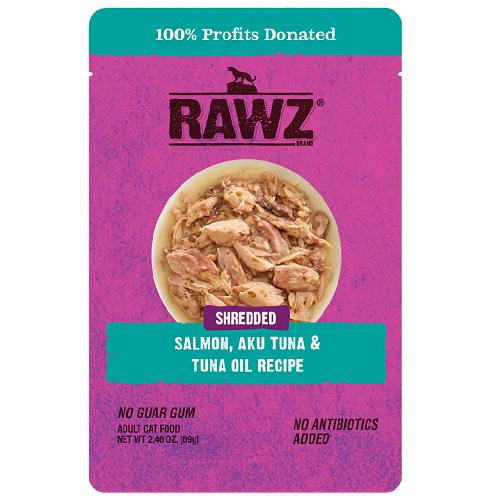 Rawz Shredded Salmon, Aku Tuna & Tuna Oil Recipe Cat FoodIngredients: Salmon, Fish Broth, Tuna, Tuna Oil, Tapioca Starch, Sunflower Oil, Potassium Chloride, Tricalcium Phosphate, Salt, Calcium Chloride, Dried Parsley, Choline Chloride, Taurine, Minerals (Iron Amino Acid Chelate, Manganese Amino Acid Chelate, Zinc Amino Acid Chelate, Calcium Iodate, Copper Amino Acid Chelate, Magnesium Amino Acid Chelate, Sodium Selenite), Vitamins (Vitamin A Supplement, Vitamin D3 Supplement, Vitamin E Supplement, Thiamine Mononitrate, Riboflavin Supplement, Pyridoxine Hydrochloride, Vitamin B12 Supplement, Niacin Supplement, d-Calcium Pantothenate, Ascorbic Acid (source of Vitamin C), Folic Acid, Biotin).Guaranteed Analysis:-Crude Protein (min.) 11%-Crude Fat (min.) 3%-Crude Fiber (max.) 1.50%-Moisture (max.) 82.00%