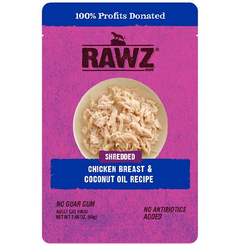 Rawz Shredded Chicken & Coconut Oil Recipe Cat FoodIngredients: Chicken, Chicken Broth, Coconut Oil, Tapioca Starch, Calcium Chloride, Potassium Chloride, Sunflower Oil, Salt, Choline Chloride, Taurine, Dried Parsley, Tricalcium Phosphate, Minerals (Iron Amino Acid Chelate, Manganese Amino Acid Chelate, Zinc Amino Acid Chelate, Calcium Iodate, Copper Amino Acid Chelate, Magnesium Amino Acid Chelate, Sodium Selenite), Vitamins (Vitamin A Supplement, Vitamin D3 Supplement, Vitamin E Supplement, Thiamine Mononitrate, Riboflavin Supplement, Pyridoxine Hydrochloride, Vitamin B12 Supplement, Niacin Supplement, d-Calcium Pantothenate, Ascorbic Acid (source of Vitamin C), Folic Acid, Biotin).Guaranteed Analysis:-Crude Protein (min.) 11%-Crude Fat (min.) 2.50%-Crude Fiber (max.) 1.50%-Moisture (max.) 82.00%