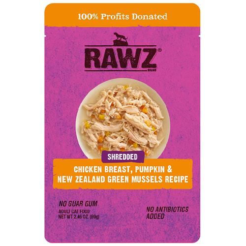 Rawz Shredded Chicken Pumpkin & Mussels Recipe Cat FoodIngredients: Chicken, Chicken Broth, New Zealand Green Mussels, Pumpkin, Mussels, Carrots, Tapioca Starch, Sunflower Oil, Calcium Chloride, Tricalcium Phosphate, Potassium Chloride, Choline Chloride, Taurine, Salt, Dried Parsley, Minerals (Iron Amino Acid Chelate, Manganese Amino Acid Chelate, Zinc Amino Acid Chelate, Calcium Iodate, Copper Amino Acid Chelate, Magnesium Amino Acid Chelate, Sodium Selenite), Vitamins (Vitamin A Supplement, Vitamin D3 Supplement, Vitamin E Supplement, Thiamine Mononitrate, Riboflavin Supplement, Pyridoxine Hydrochloride, Vitamin B12 Supplement, Niacin Supplement, d-Calcium Pantothenate, Ascorbic Acid (source of Vitamin C), Folic Acid, Biotin).Guaranteed Analysis:-Crude Protein (min.) 11%-Crude Fat (min.) 1.50%-Crude Fiber (max.) 1.50%-Moisture (max.) 82.00%