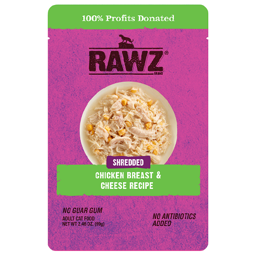 Rawz Shredded Chicken & Cheese Recipe Cat FoodIngredients: Chicken, Chicken Broth, Cheese, Tapioca Starch, Sunflower Oil, Calcium Chloride, Potassium Chloride, Salt, Choline Chloride, Taurine, Dried Parsley, Minerals (Iron Amino Acid Chelate, Manganese Amino Acid Chelate, Zinc Amino Acid Chelate, Calcium Iodate, Copper Amino Acid Chelate, Magnesium Amino Acid Chelate, Sodium Selenite), Vitamins (Vitamin A Supplement, Vitamin D3 Supplement, Vitamin E Supplement, Thiamine Mononitrate, Riboflavin Supplement, Pyridoxine Hydrochloride, Vitamin B12 Supplement, Niacin Supplement, d-Calcium Pantothenate, Ascorbic Acid (source of Vitamin C), Folic Acid, Biotin).Guaranteed Analysis:-Crude Protein (min.) 11%-Crude Fat (min.) 1.50%-Crude Fiber (max.) 1.50%-Moisture (max.) 82.00%
