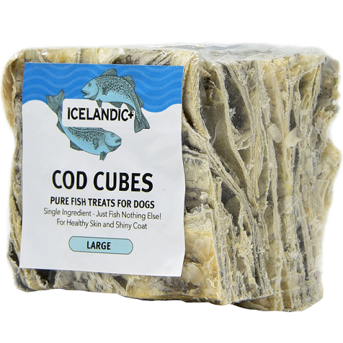 Icelandic Plus Cod Cubes - Pure Fish Treats For DogsOur 100% natural and edible Icelandic Cod Skin Cubes are single ingredient and contain no additives, preservatives or supplements. The Cod Skin Cubes are 6ml x 6ml squared long and weigh an average of 4-oz each. They come from only the pure icy waters of Iceland and are fresh caught daily and processed immediately. Not only are they delicious for your dog, they reduce tartar and plaque build up for healthier gums and teeth. They are also a great natural source of Omega-3 fatty acids, promoting healthy skin and coat for your pet. With just one ingredient, theses tasty and healthy treats are perfect for dogs with sensitivities.