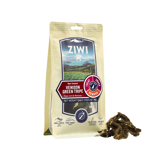 ZiwiPeak: Venison Green TripeInspired by the dog's natural diet, these tasty treats feature cold-washed venison green tripe, ethically sourced from New Zealand free-range farms. Made simply by slow and gentle air-drying - locking in Mother Nature's goodness, without added artificial preservatives or flavors. A perfect guilt-free treat for all of life's tail-wagging adventures.Ingredients: