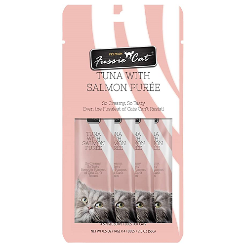 Fussie Cat Purée is love at first lick.Creamy in texture and rich in taste, this indulgent, flavorsome puree will make even the Fussiest of Cats demand more! Fussie Cat Purée is an easy-to-feed cat treat with essential vitamin E for your cat’s diet to support healthy skin and coat.