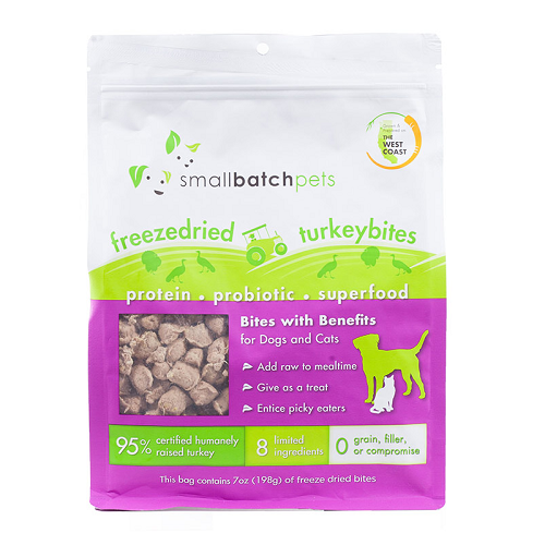 Single-source protein treats for dogs and cats featuring 95% meat, organ and bone, fermented purple cabbage probiotic and a different superfood with each flavor. Great for adding to mealtime or as treats.